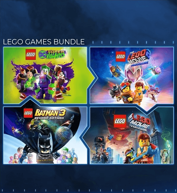Crea tu biblioteca con el Paquete de Juegos LEGO, que incluye LEGO DC Supervillanos, LEGO Batman 3: Más Allá de Gotham, La LEGO Película: El Videojuego y La LEGO Película 2: El Videojuego.